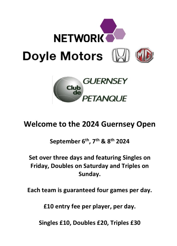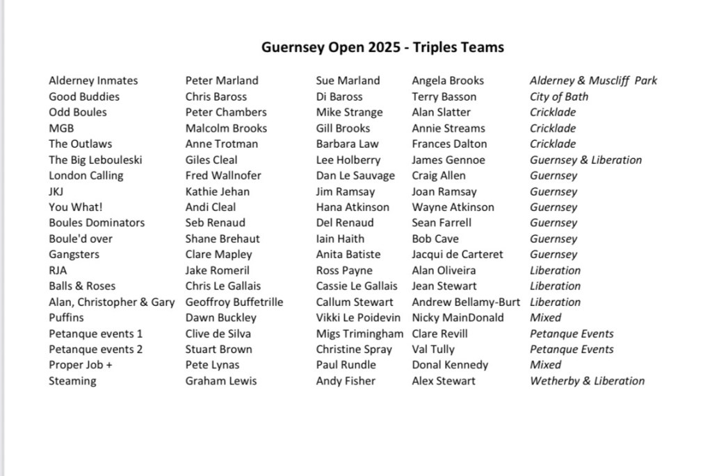 Thirty-two doubles teams and twenty triples teams from the UK, Jersey and Guernsey contested the annual Guernsey Pétanque Open which returned last weekend after a two year covid enforced break. The major honours over the weekend were shared with a Jersey team winning the Doubles and a Guernsey team winning the Triples over two days of hard fought matches.