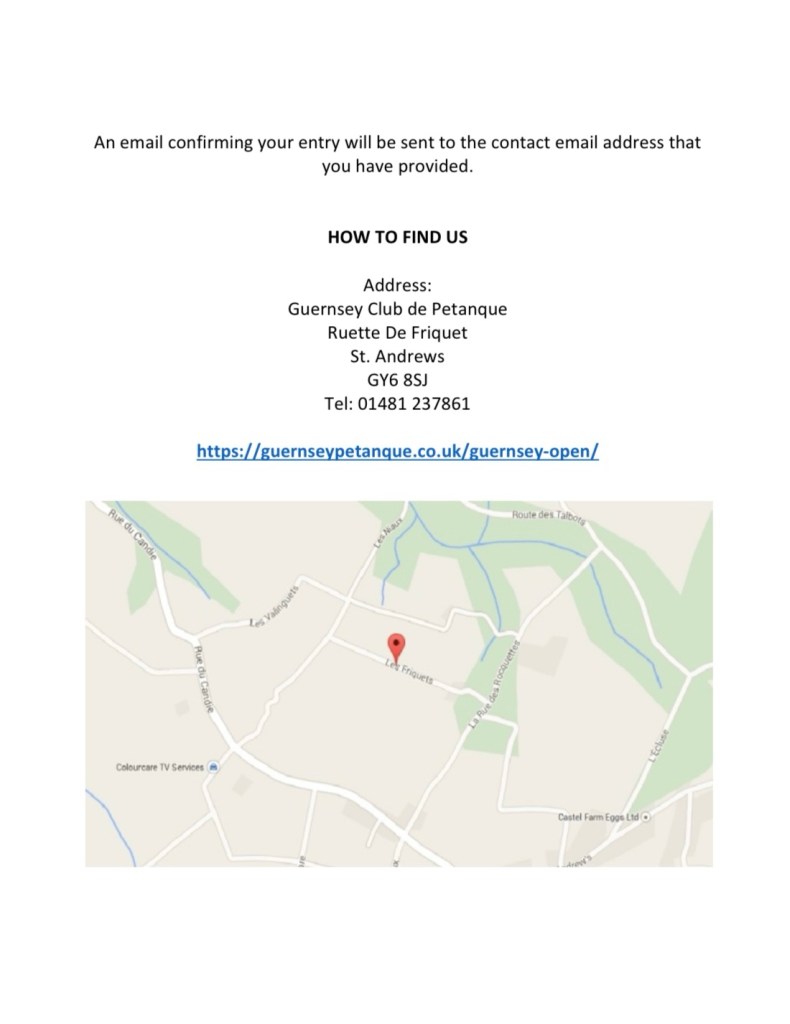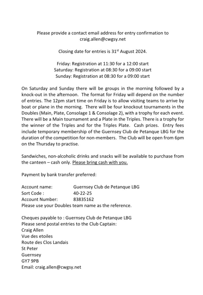 Andrew Bellamy-Burt won the 2025 Guernsey Open Singles competition. He beat Ross Payne in the final. The last eight comprised of five teams from Jersey, two from Pétanque Events in the UK and one from Guernsey. Clare Revill beat Geoffroy Buffetrille, Craig Allen beat Callum Stewrt, Ross Payne beat Tony Northern and Andrew Bellamy-Burt beat Clive da Silva.