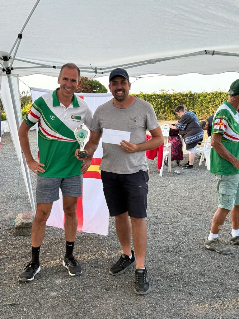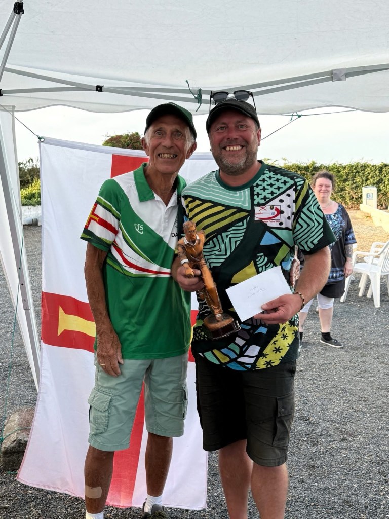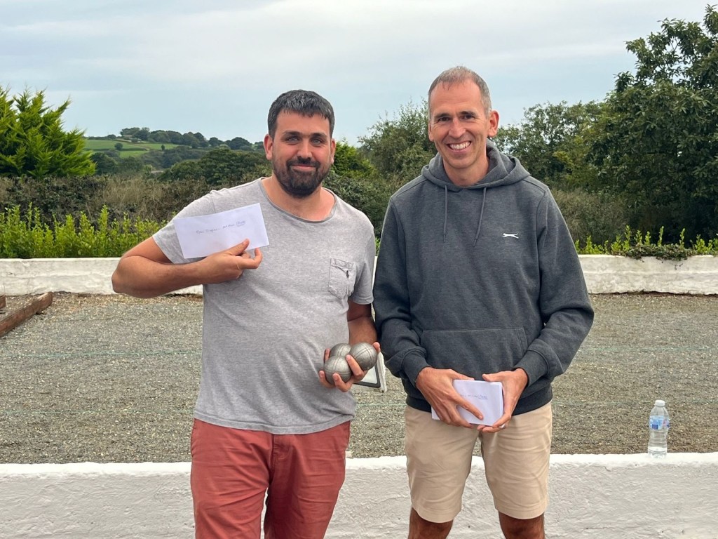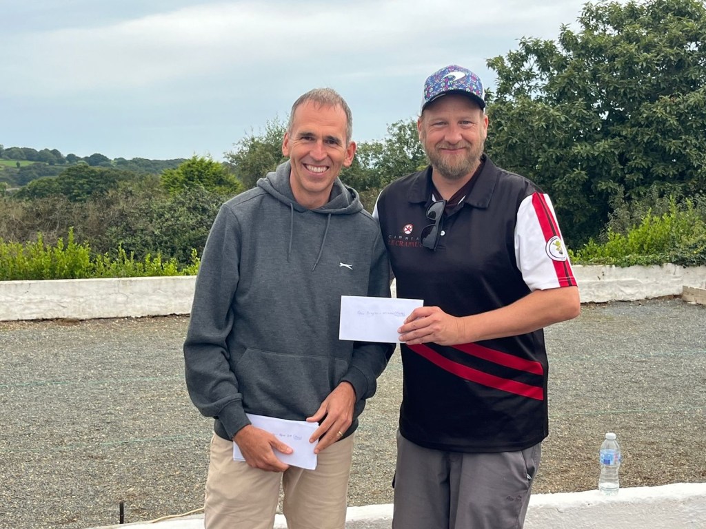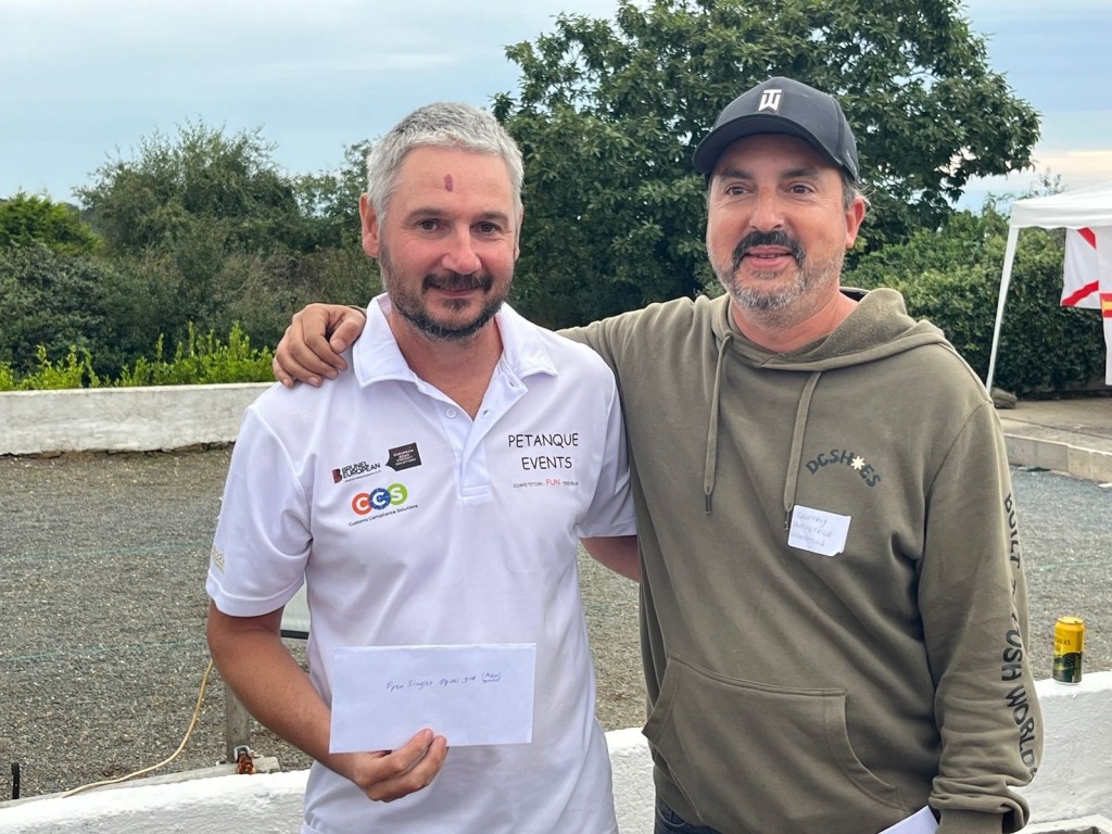Giles Cleal and Lee Holberry have won the Guernsey Open, beating Geoffroy Buffetrille and Andy Bellamy 13-12. At 12-12 in the final end with Guernsey holding, Geoffroy placed his last boule in front to win the point. Lee and Giles were left with three boules to hit it out. They kept the crowd on their toes by doing so with the last throw of the day. Congratulations to them!