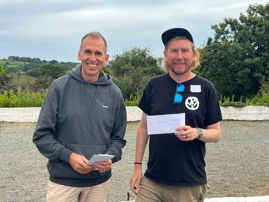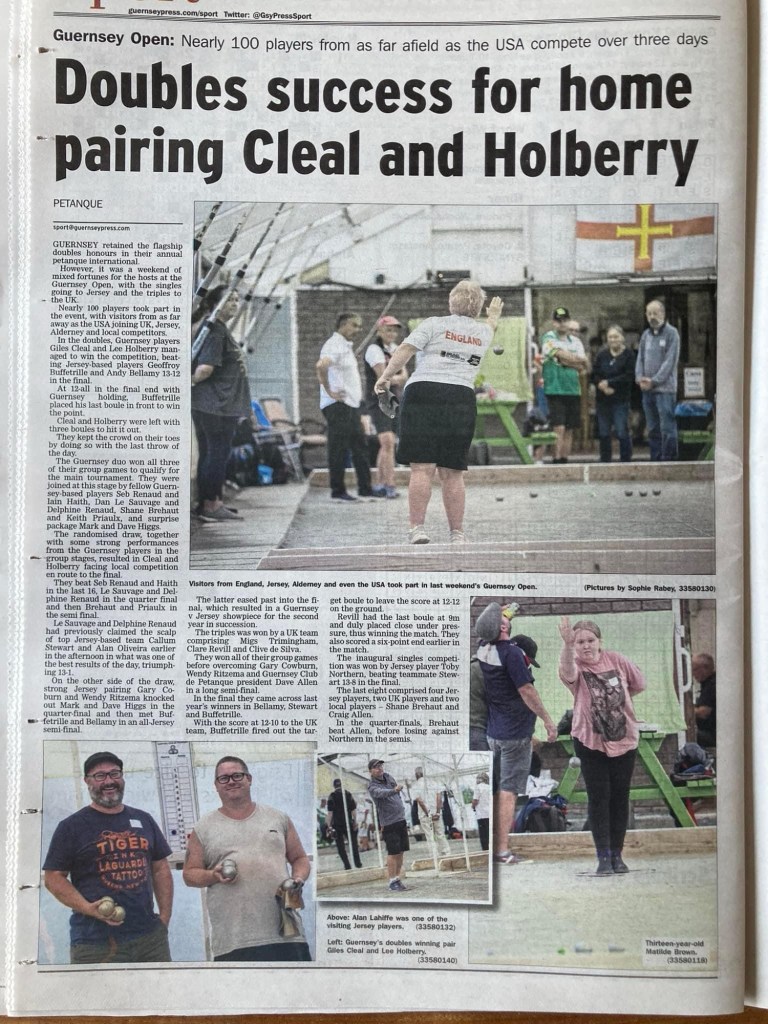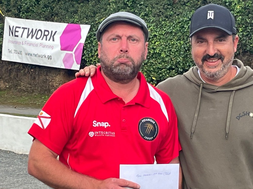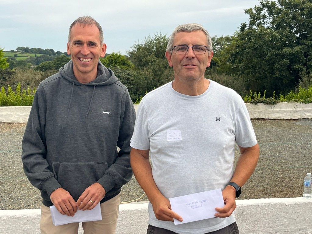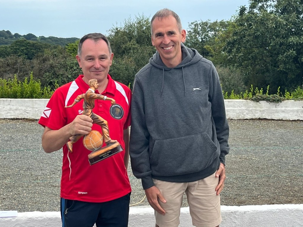 Giles Cleal and Lee Holberry have won the Guernsey Open, beating Geoffroy Buffetrille and Andy Bellamy 13-12. At 12-12 in the final end with Guernsey holding, Geoffroy placed his last boule in front to win the point. Lee and Giles were left with three boules to hit it out. They kept the crowd on their toes by doing so with the last throw of the day. Congratulations to them!