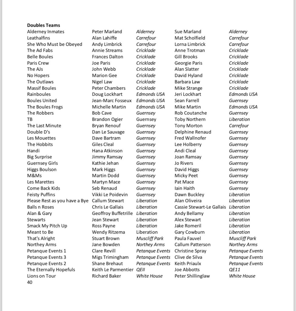 Allen and Tulie fared better, narrowly beating a strong Jersey team Callum Stuart and Andrew Bellamy-Burt in their first afternoon match before succumbing 13-11 to another experienced Pétanque Events team, despite having led throughout most of the match. Whilst the Guernsey team still had an outside chance of topping the group going into the final match, they were well beaten by a strong Jersey team Matt Pinel and Laurent Pellaton in the final round, losing 13-8, but received the consolation prize of being the top local team in the Doubles. With Pinel and Pellaton also having beaten their Jersey team mates Stuart and Bellamy-Burt, they remained undefeated in the afternoon and topped their group.