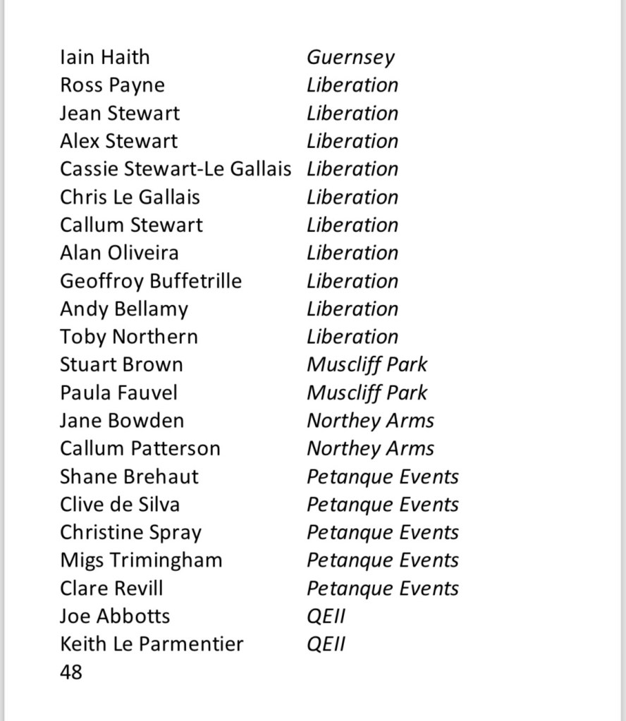 The last eight comprised four Jersey players from Liberation: Toby, Callum, Geoffroy Buffetrille & Andy Bellamy. They were joined by three Pétanque Events players, two from the UK: Clare Revill and Clive de Silva, as well as locally based player Shane Brehaut. Craig Allen was the sole Guernsey Club representative.