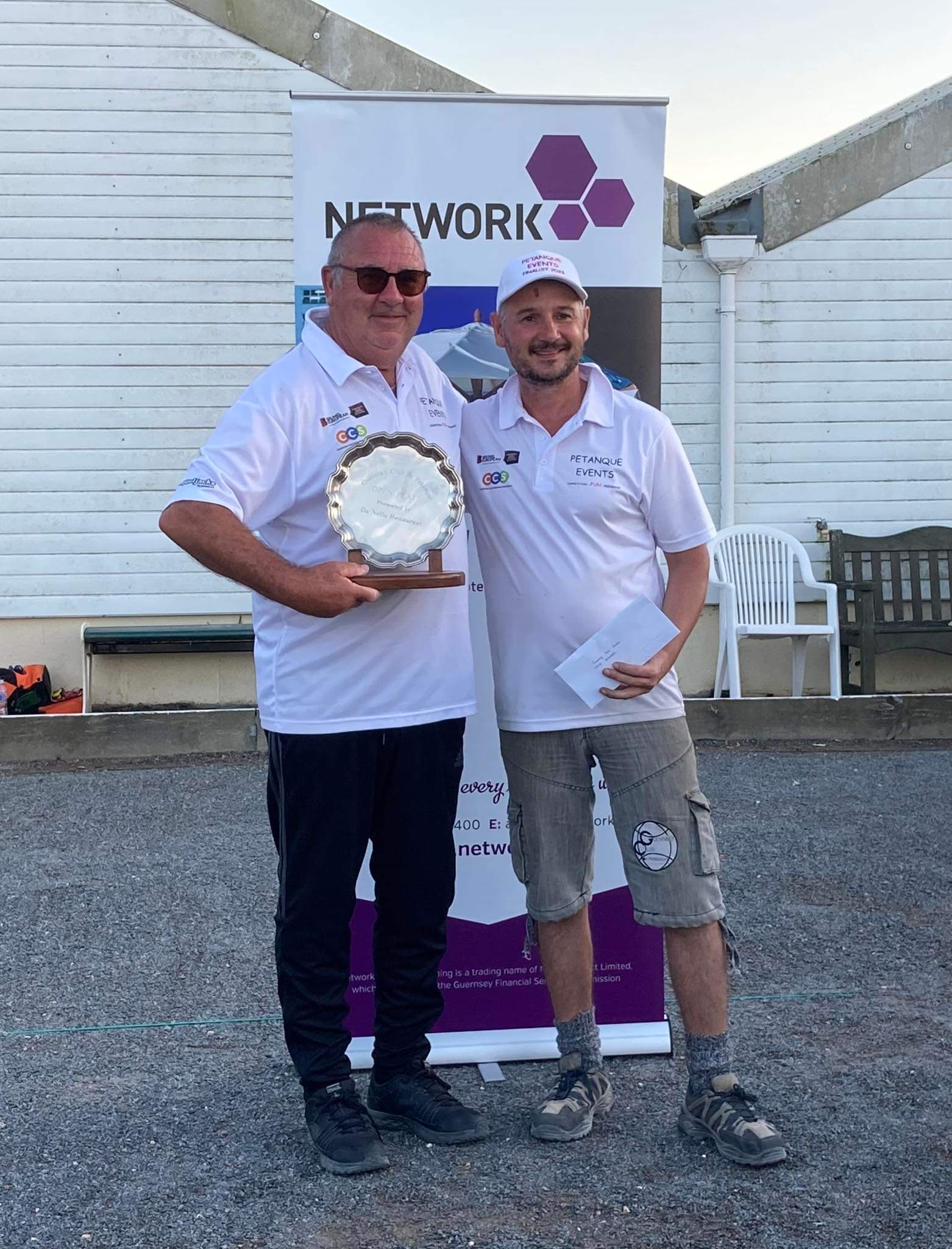 Giles Cleal and Lee Holberry have won the Guernsey Open, beating Geoffroy Buffetrille and Andy Bellamy 13-12. At 12-12 in the final end with Guernsey holding, Geoffroy placed his last boule in front to win the point. Lee and Giles were left with three boules to hit it out. They kept the crowd on their toes by doing so with the last throw of the day. Congratulations to them!